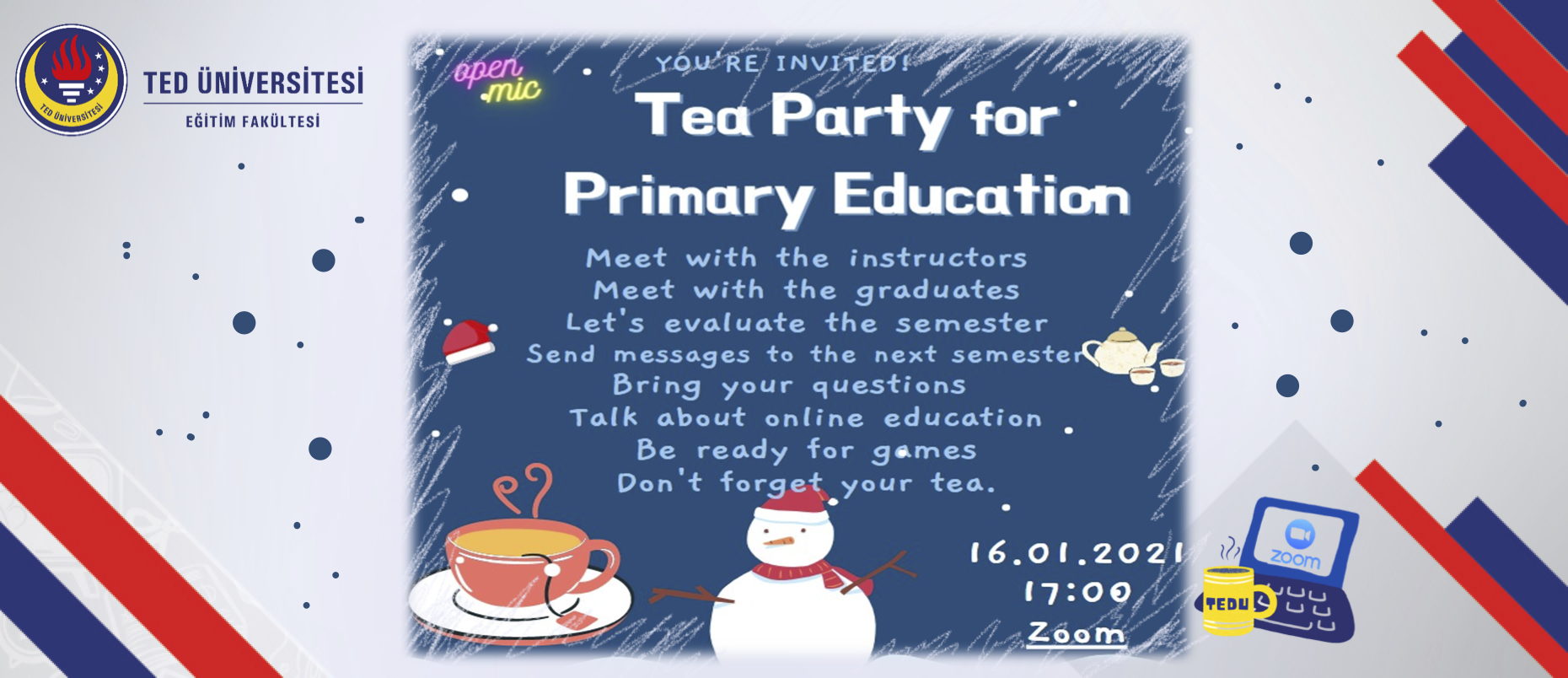 TEDU Primary Education students organize a Tea Partyon Zoom 16.01.2021 Saturday at 17:00. In this tea party, both the evaluation of the online education process and various activities are planned with the participation of the teacher candidates, graduates and primary education faculty staff. We are looking forward to seeing all invitees for the Tea Party.
