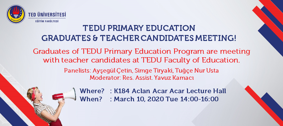 TEDU Department of Elementary Education will organize a panel discussion where graduates of primary school teachers will share their processes related to the teaching profession. As the graduates and now primary teachers Simge Tiryaki, Ayşegül Çetin and Tuğçe Nur Usta are the panelists of this meeting to talk about their experiences of teacher training and inservice training processes. The panel will be on March 10, 2020 between 14:00-16:00 in K184 Aclan Acar Lecture Hall, moderated by Research Assistant Yavuz Kamacı.